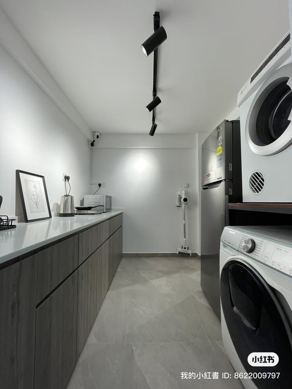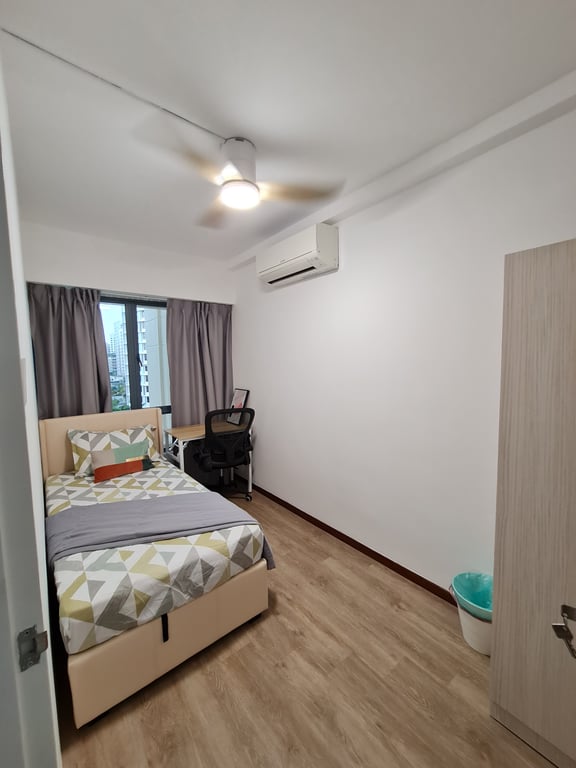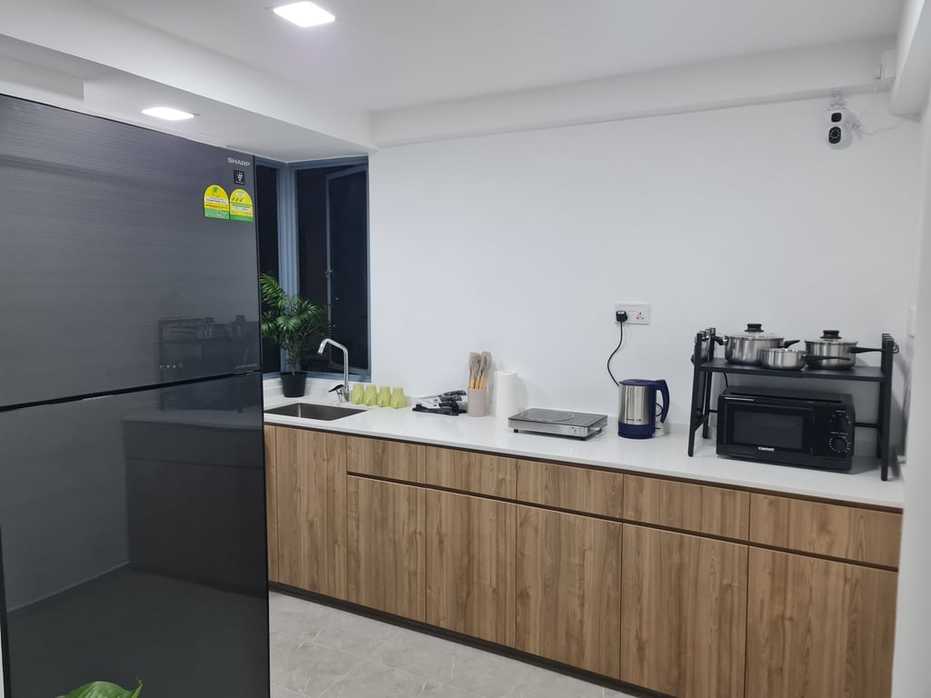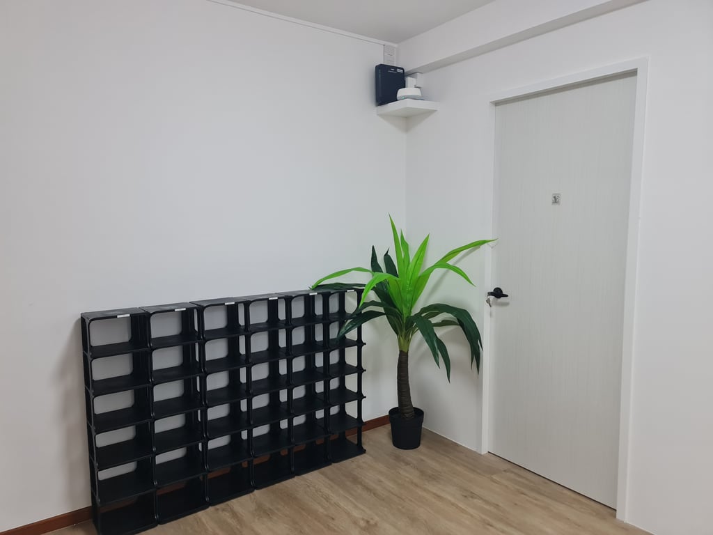 Establish clear common area rules and assign personal storage spaces in each bedroom. Use the third bedroom strategically - as a study, guest room, or helper's quarters. Create a household schedule for shared spaces like bathrooms and kitchen. Consider installing additional hooks and organizers in common areas to prevent clutter.