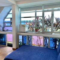- Another glass room is around 200 square feet with a mini garden theme. It has sofa bed with comfortable tatami mattress added on. Another standby super single foldable bed is provided