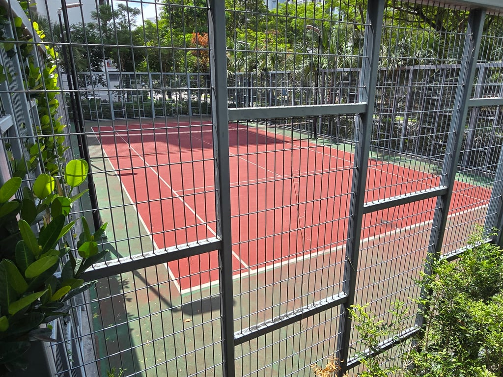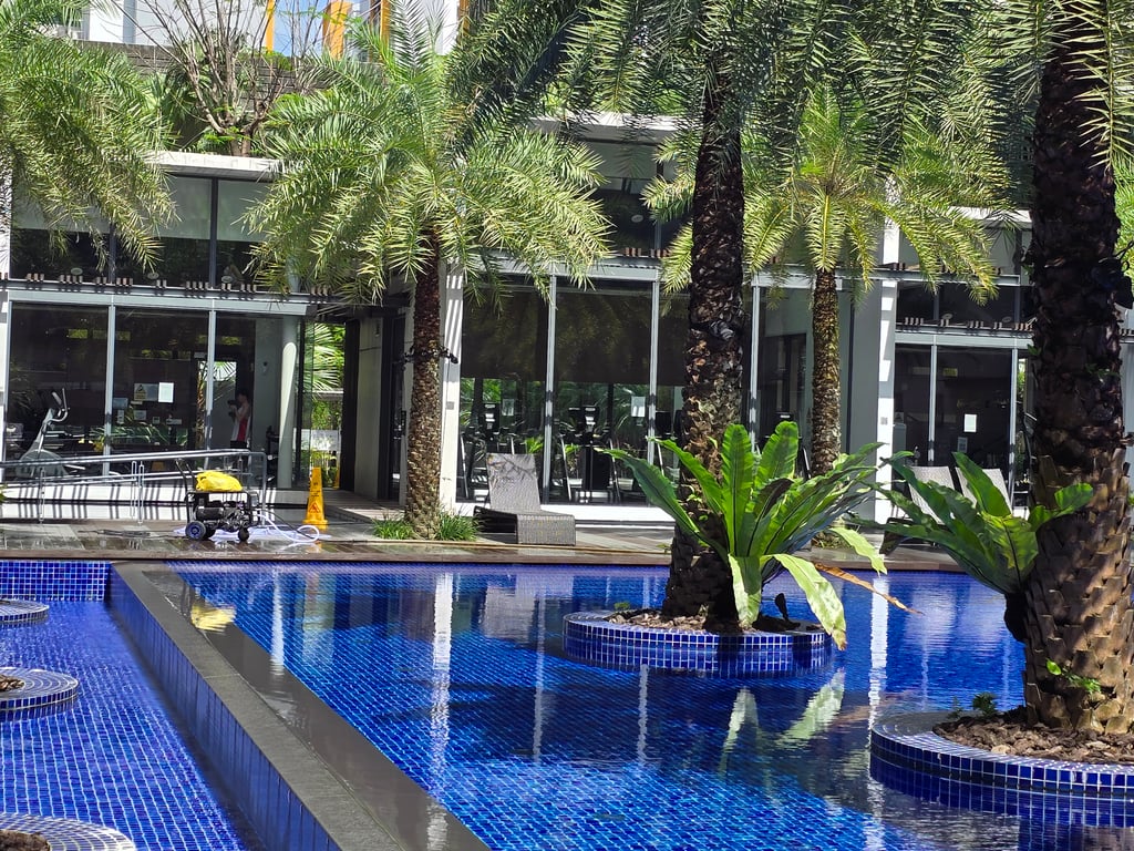 Full Facilities: Access to 50m lap pool, aqua gym, glass-walled gym, and pizzeria pavilions.