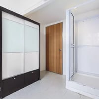 Personal bathroom for showering. Personal bar fridge.
