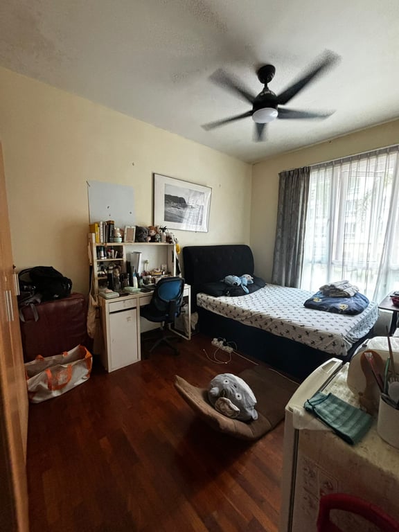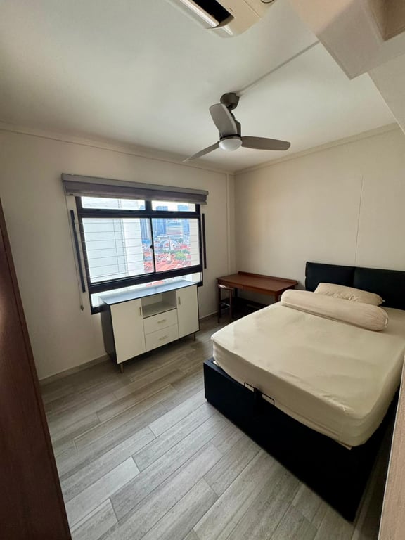 Queen bed, wardrobe, fan, table.....