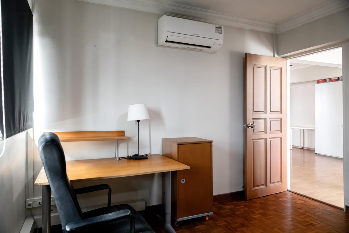 Large common bedroom (13 sq m/145 sq ft ) with no afternoon sun, has a double bed, wardrobe with mirror, air-con & writing desk w/chair.