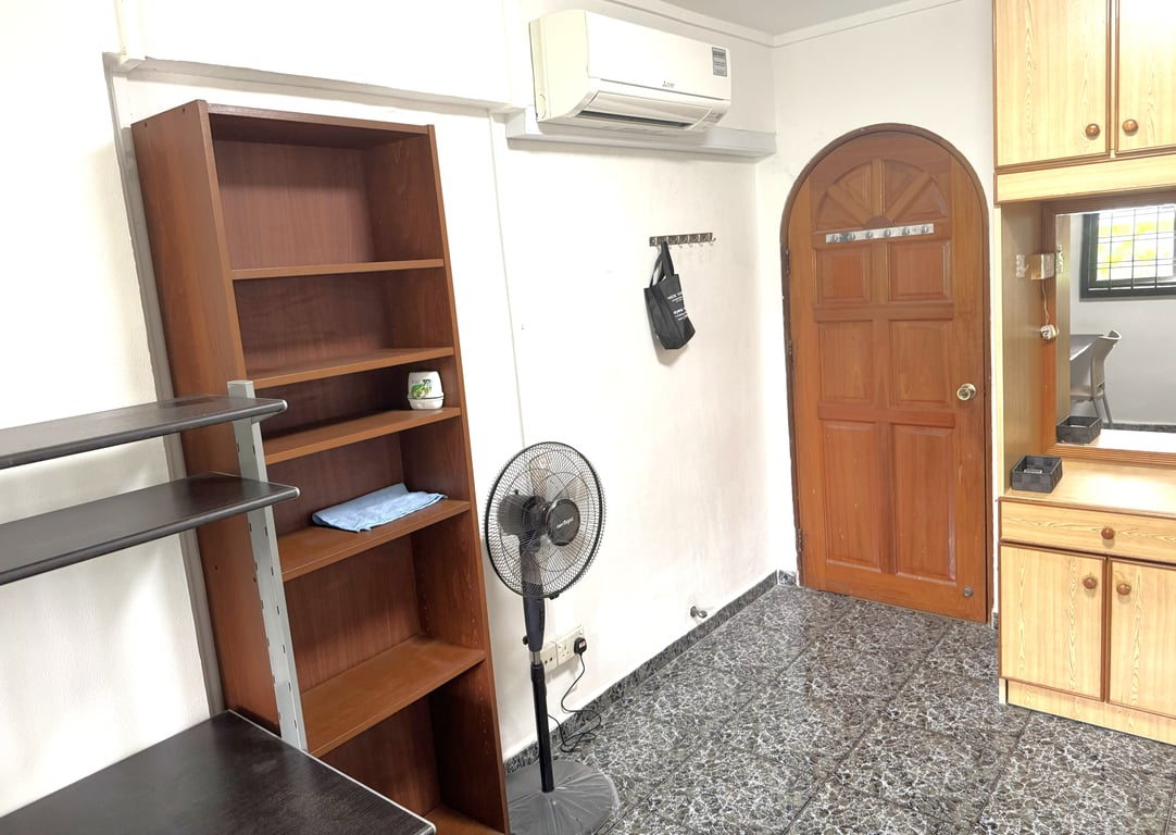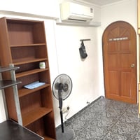 1 Cozy common room for rent. Includes a built-in wardrobe, a fan, and a small desk. The room is well-lit and has a new air conditioner.