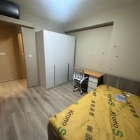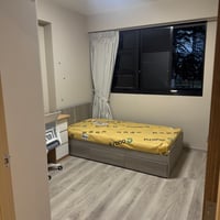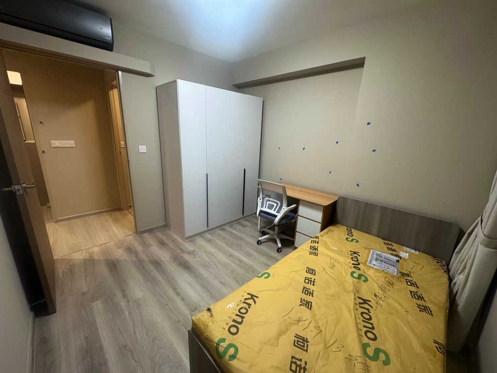Fully furnished with brand‑new air conditioner, wardrobe, table, chair, bed, curtains, and standing fan.