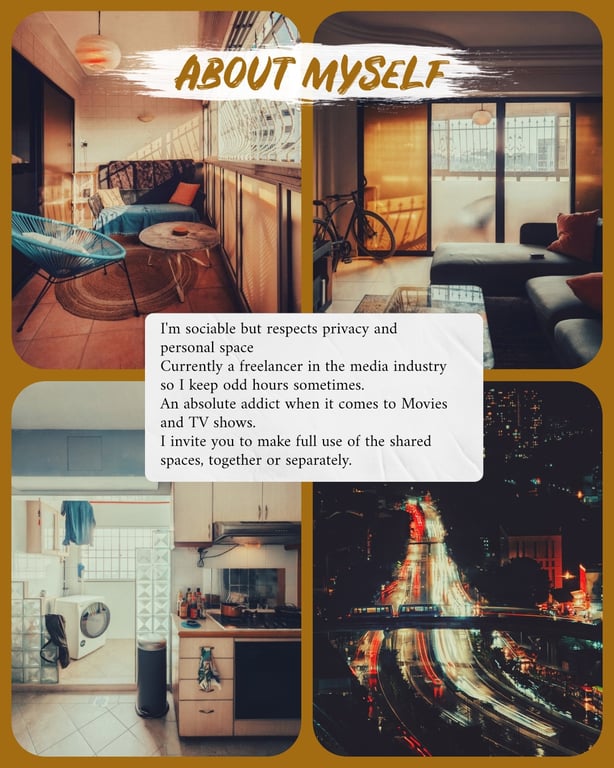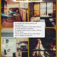 - You'll be housemates with a freelance media professional with odd and random schedules but I'm not disruptive or loud. Friendly but respectful of privacy.