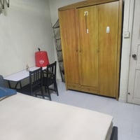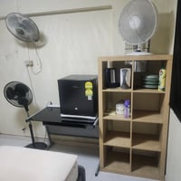 Equipped with a standing fan, wall fan, and mini fridge.
