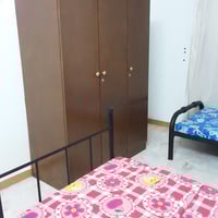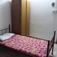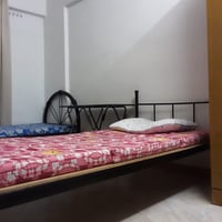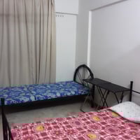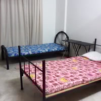•Two single beds with metal frames, each with a mattress and bedsheet (one in blue, the other in pink with cartoon/flower prints).