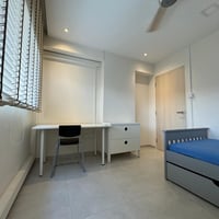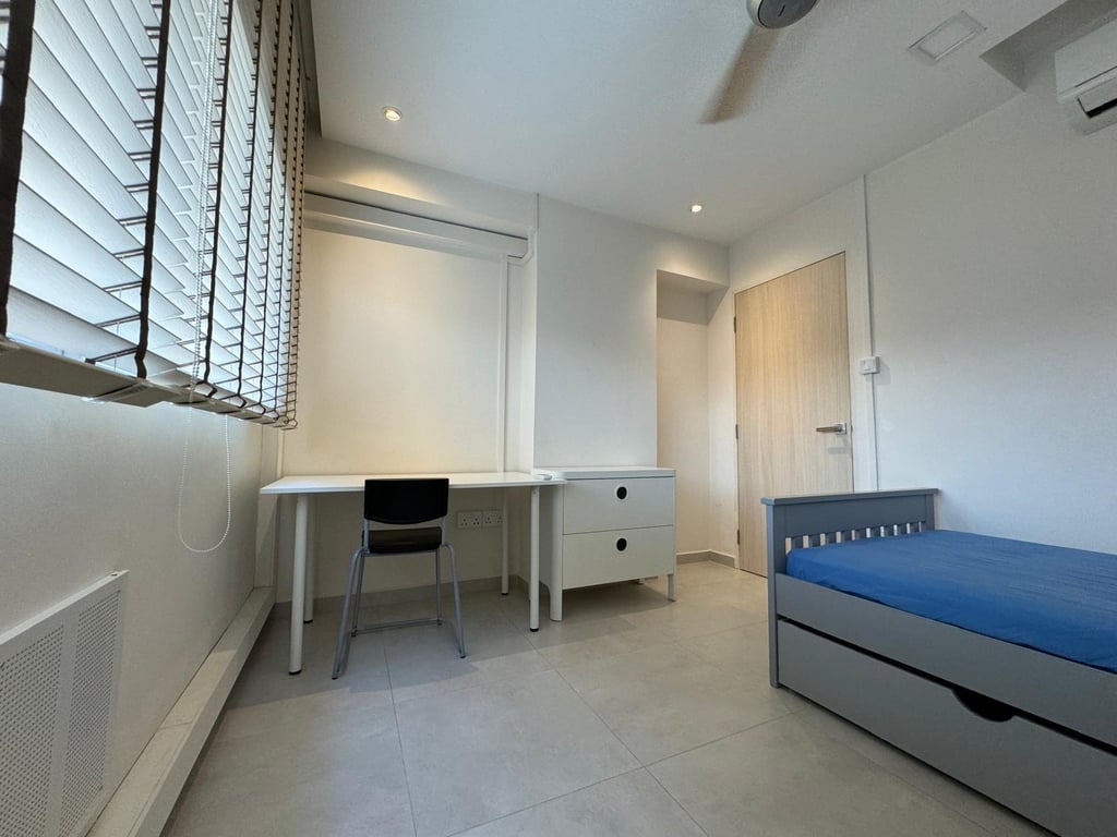 · Fully furnished with a brand-new wardrobe, full-size study desk and chair, super-single bed frame with new mattress, bedding, a bedside drawer and a chest drawer.