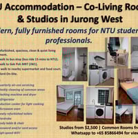 Newly furbished rooms and studios available near NTU, CleanTech Park and Jurong area. Ideal for students and working professionals seeking a clean, modern, spacious and quiet living environment with convenience and comfort!