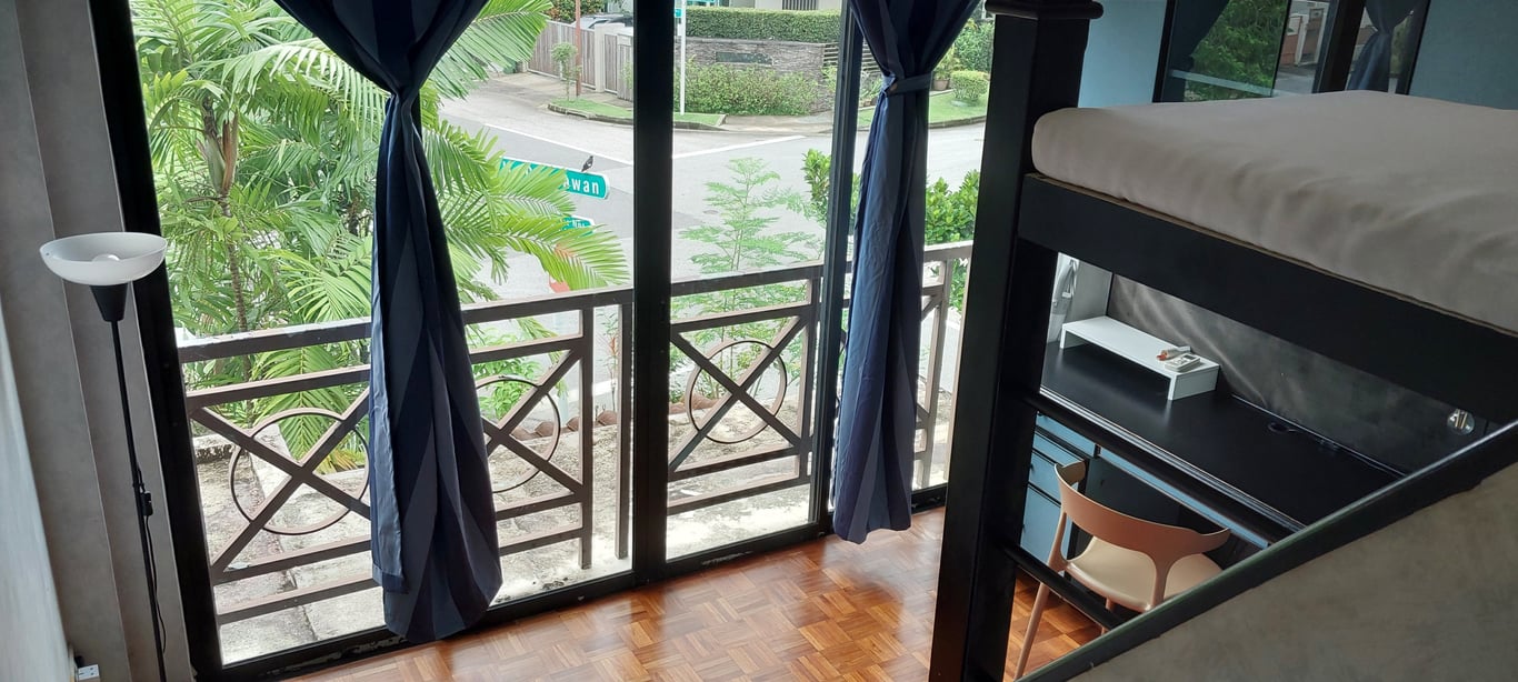 Spacious room, loft bed, floor to ceiling glass doors looking out to greenery. Very quiet house, female environment.